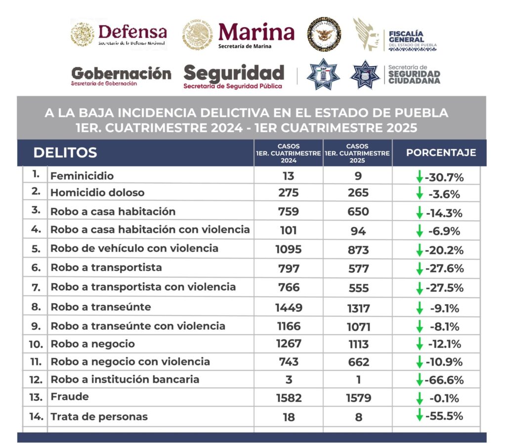Pastor Betancourt precisó que esta información está basada en las estadísticas de la Fiscalía General del Estado, registradas en el primer cuatrimestre de 2025, en relación con el primer cuatrimestre de 2024, tratándose del feminicidio, homicidio doloso, robo a casa habitación, de vehículo con violencia, a transportistas, a transeúntes, a negocios, a instituciones bancarias, fraude y trata de personas, entre otros.